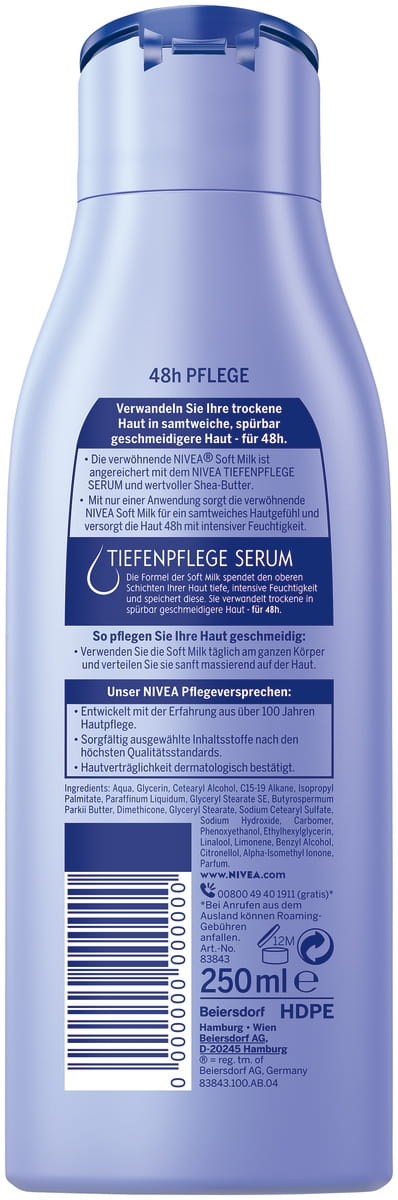 The latest testing methods have shown that the perfect combination of high quality ingredients of our NIVEA body milk and lotions together with the NIVEA DEEP MOISTURE SERUM penetrates deeply into the skin, locking moisture and providing deep moisture for 48h. An effect you can not only feel but also see. Give your dry skin the relief it needs and deserves!